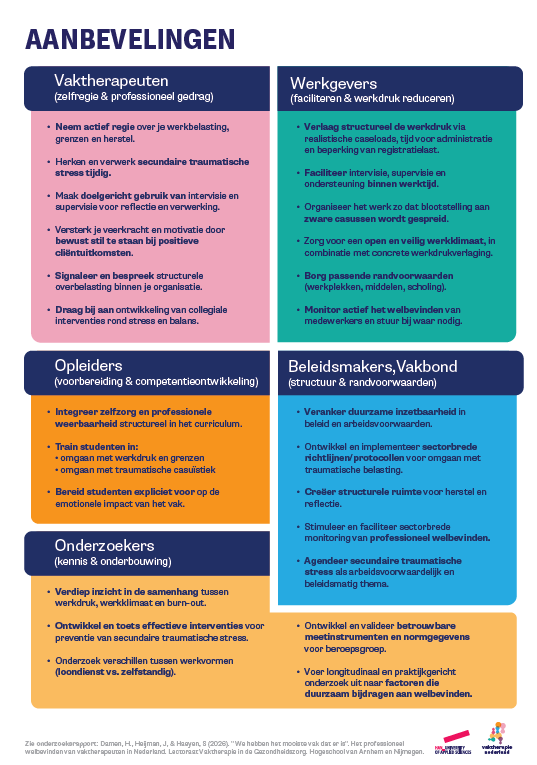 In het rapport vind je gerichte aanbevelingen voor jou als vaktherapeut, voor werkgevers, opleidingen en beleidsmakers. Centraal staan het structureel verlagen van werkdruk, het erkennen van secundaire traumatische stress en het bewust versterken van compassie‑satisfactie en zelfzorg.