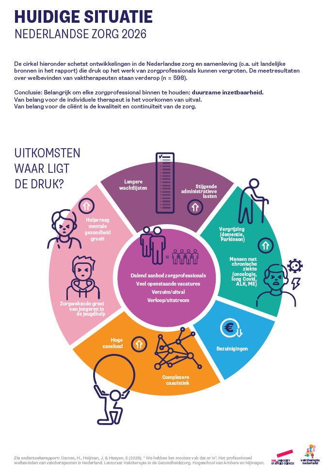 In 2026 is het onderzoek “We hebben het mooiste vak dat er is!” Het professioneel welbevinden van vaktherapeuten in Nederland afgerond dat het lectoraat Vaktherapie in de Gezondheidszorg van de HAN heeft uitgevoerd in samenwerking met ons als Vaktherapie Nederland. In totaal hebben 598 vaktherapeuten een uitgebreide vragenlijst ingevuld over burn‑out, werkdruk, secundaire traumatische stress, werkklimaat, randvoorwaarden en compassie‑satisfactie.