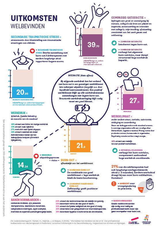 De resultaten laten een genuanceerd beeld zien. Gemiddeld rapporteren vaktherapeuten weinig burn‑outklachten en een lage tot matige werkdruk. Tegelijkertijd scoort de beroepsgroep hoog op secundaire traumatische stress in vergelijking met internationale referentiegroepen. Het intensieve werken met trauma en complexe problematiek laat zijn sporen na en werkt geregeld door in het professioneel welbevinden van vaktherapeuten. Een opvallend positieve uitkomst is de zeer hoge compassie‑satisfactie: vaktherapeuten halen veel energie uit cliëntgroei, de therapeutische relatie en de creatieve vrijheid in hun werk. Deze factoren spelen een belangrijke beschermende rol tegen burn‑out. Toch heeft 21% van de vaktherapeuten ooit langer dan drie maanden werkuitval gehad. Dit onderstreept het belang van preventie.