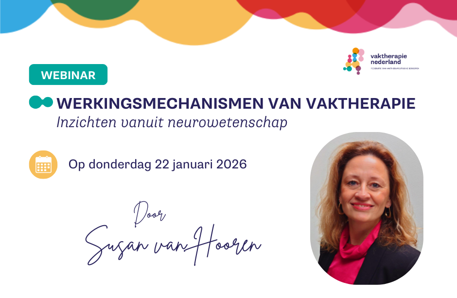 Je hebt als lid van je beroepsvereniging, aangesloten bij Vaktherapie Nederland, een uitnodiging gehad voor dit webinar. Heb je het gemist en wil je het programma graag terugzien? Dat kan tot donderdag 26 februari 2026 achter de inlog op de pagina Online sessies en webinars. Je vindt hier ook de bijbehorende presentatie.